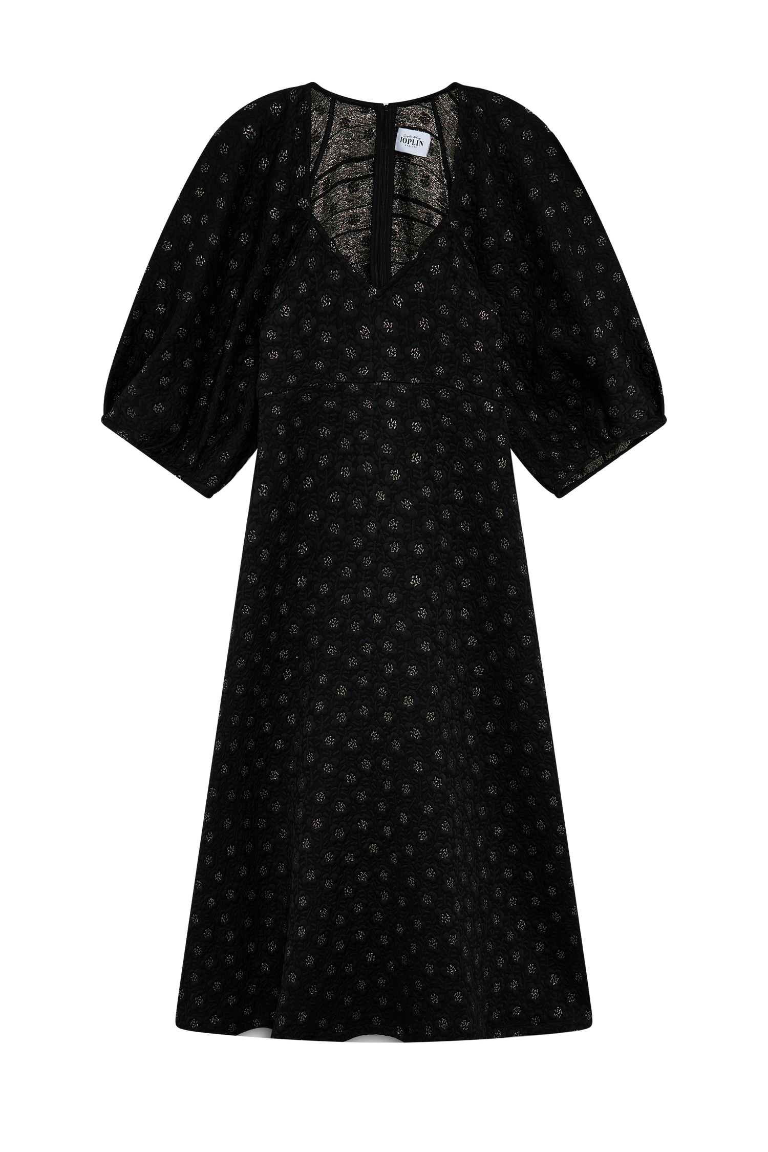 Vestit de jacquard negre amb relleu. Motiu floral amb una subtil brillantor de lamé daurada al centre. Mànigues inflades i tanca amb cremallera a l'esquena.
