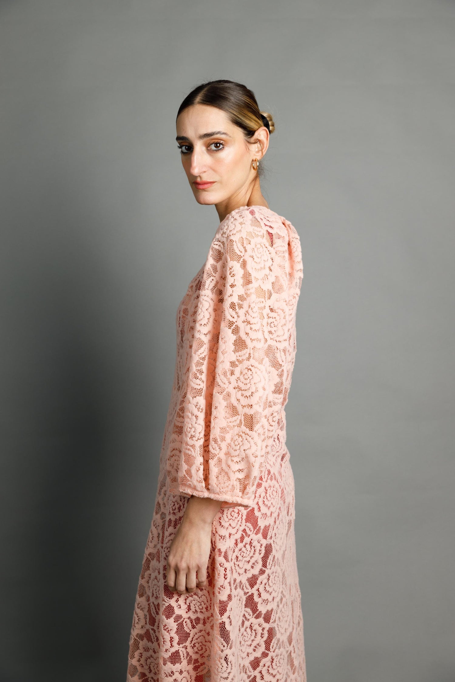 Vestit d'encaix llanós semitransparent. Mànigues amb volum i cremallera a l'esquena.