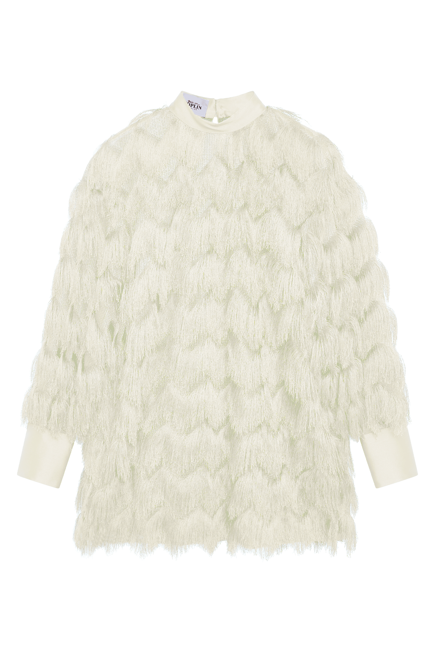 Soft fringed mini dress with jacquard cuffs and collar. Back opening and lined button closure.