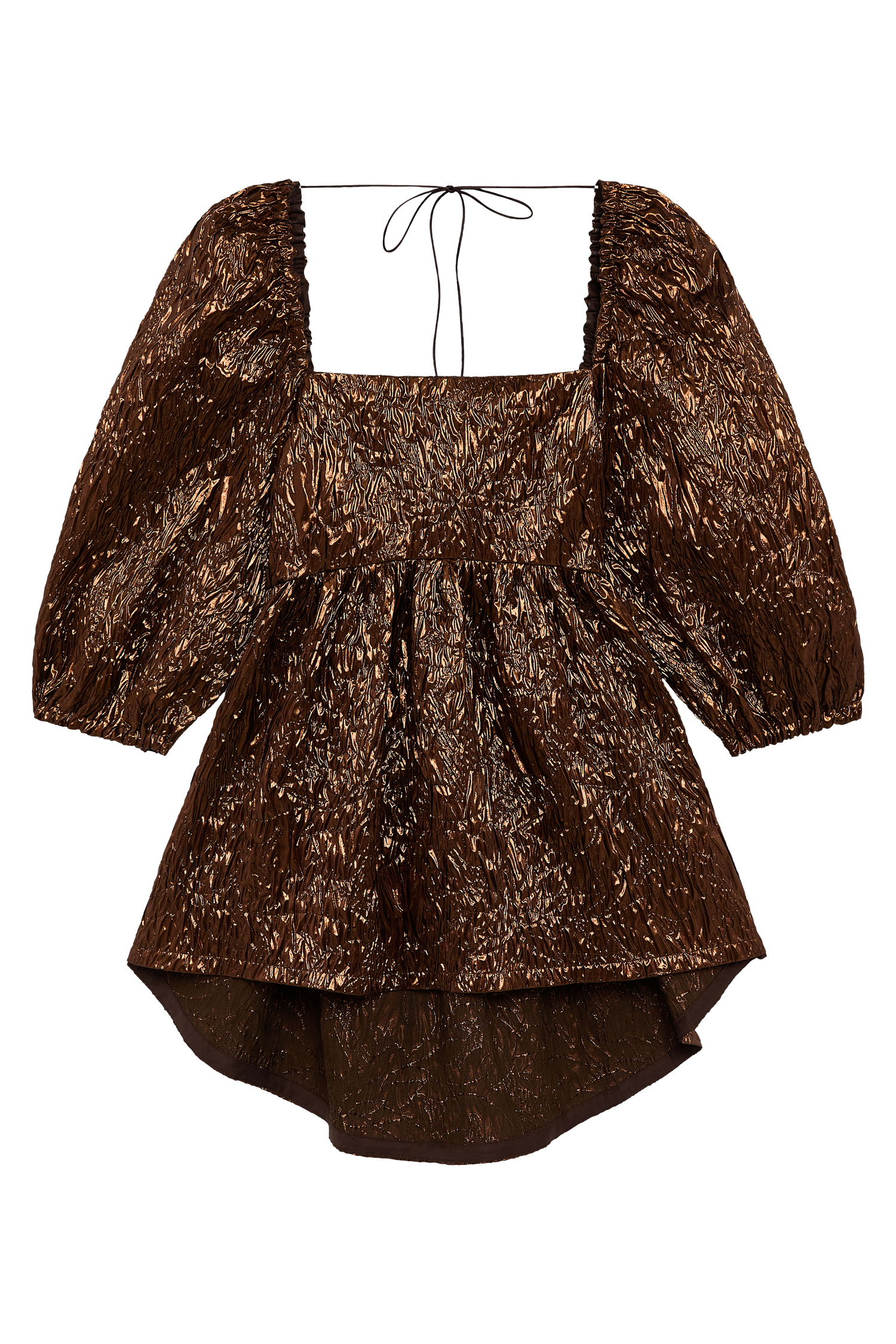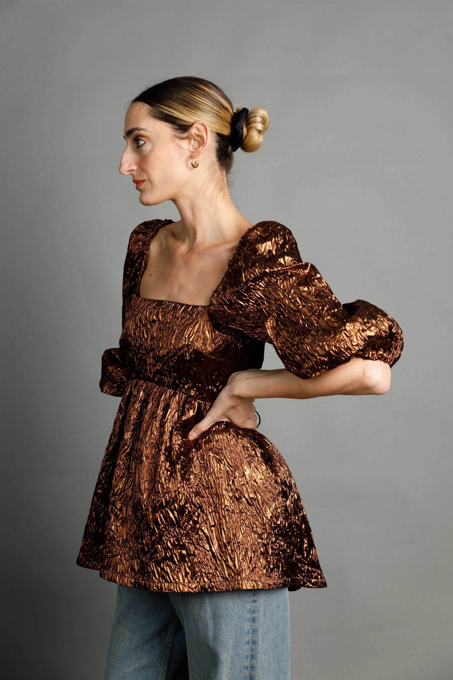 Metallic silk jacquard top. Lightweight with puff sleeves and an adjustable back.