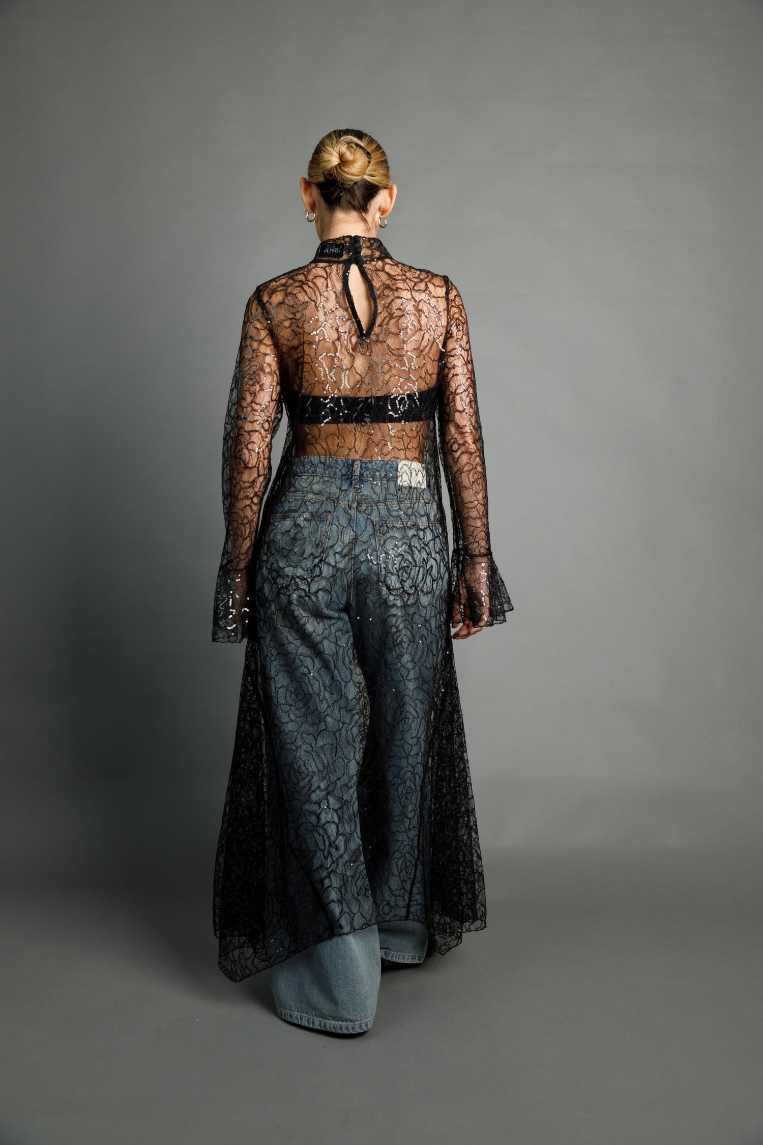 Sheer embroidered lace dress with mini sequins. Asymmetrical hem and a perkins collar with button closure at the back.